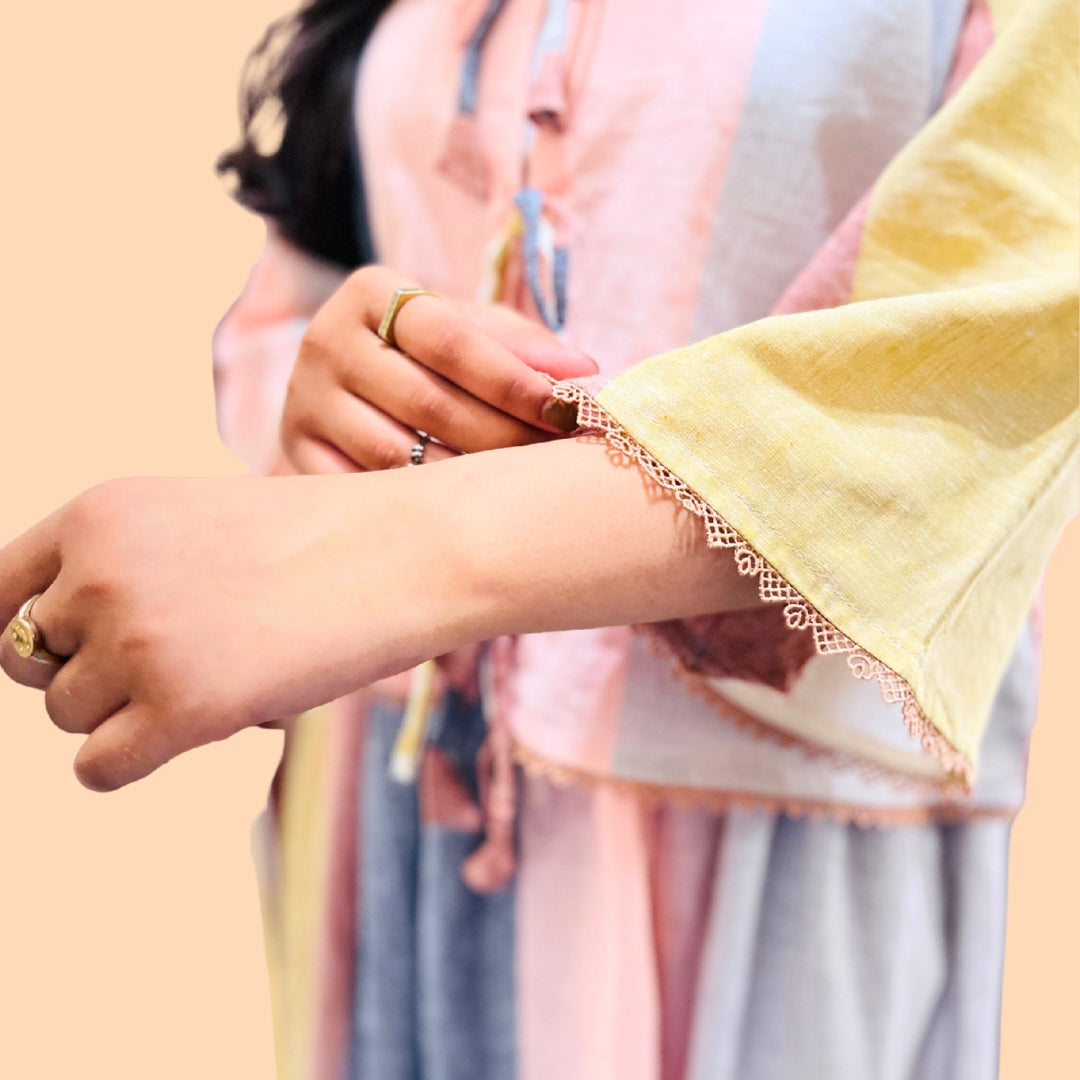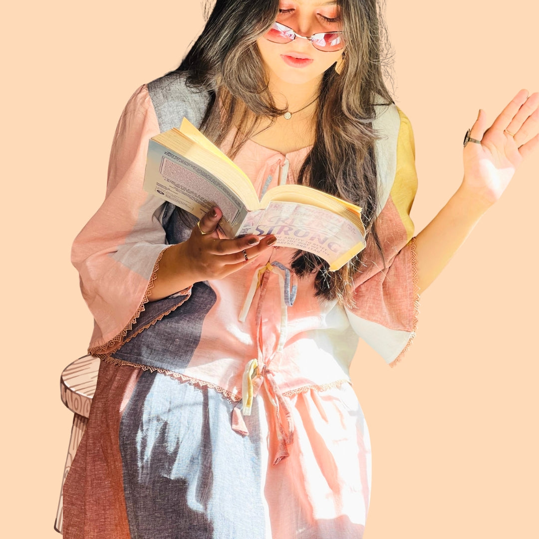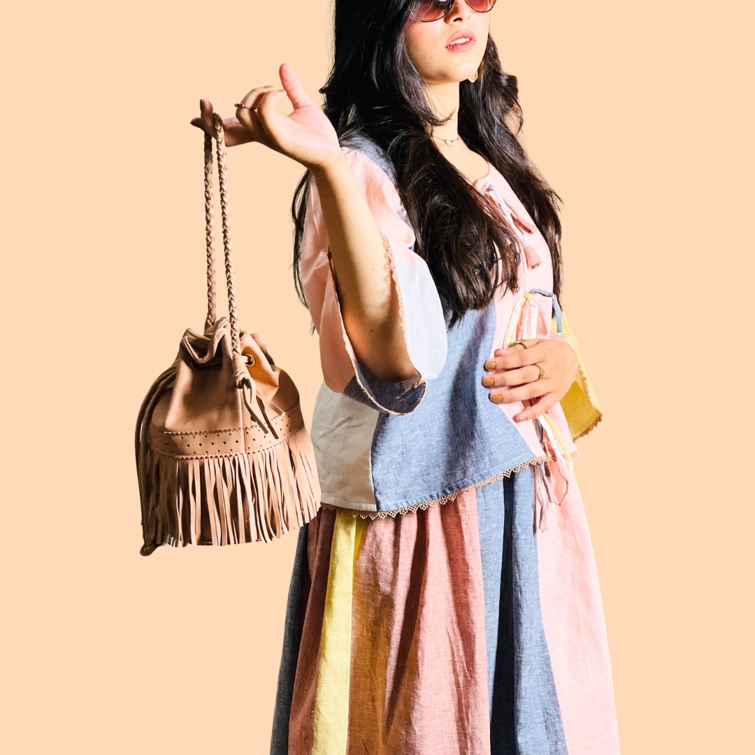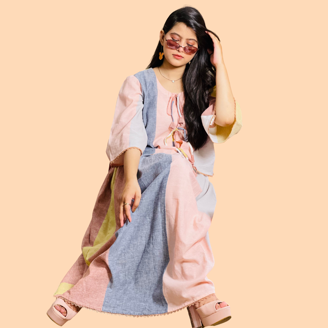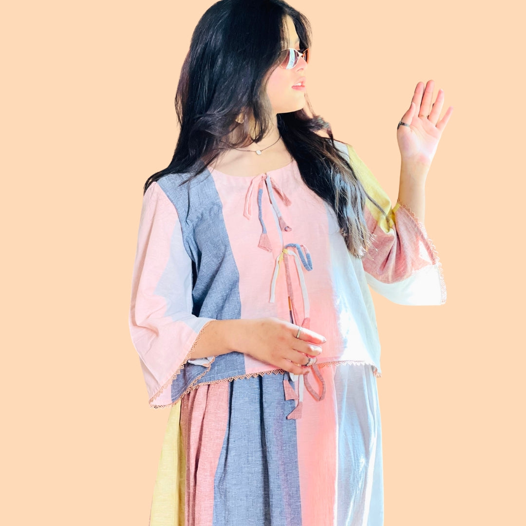 A stylish two-piece dress featuring a flattering skirt and a chic front bow detail. Designed in a vibrant multicolor palette, this set blends elegance with playful charm, making it perfect for standout day or evening looks.